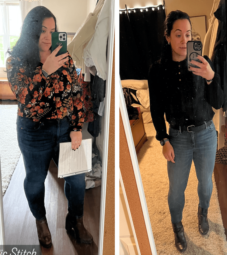 & (Right) Selfie before an April 2024 meeting (size M top, size 6 jeans, no makeup, natural hair)