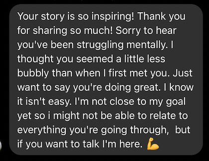 I am so humbled by all of the people who have told me that I inspire them — that I’m the reason they’ve decided to take back control of their health, too. I didn’t realize how many people I’d help. I also didn’t realize how much I’d need the support of those around me, especially lately. The people in my life have helped me more than they know.